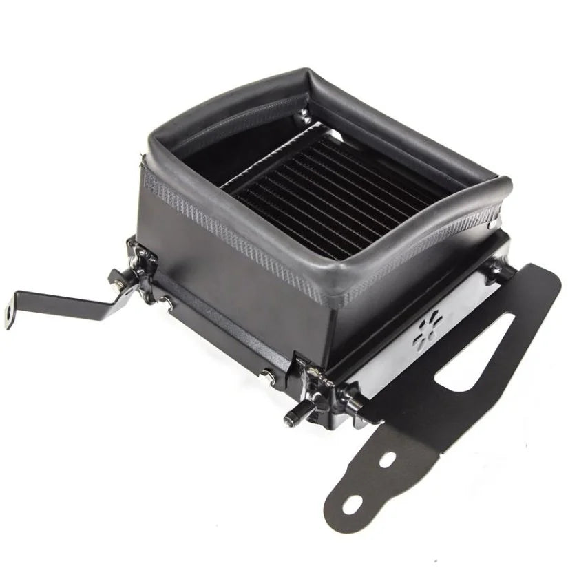 The radiator is plumbed directly into the existing oil/water heat exchanger system to improve the car’s overall capacity and cooling ability, allowing it to maintain a steady temperature for longer during hard use.