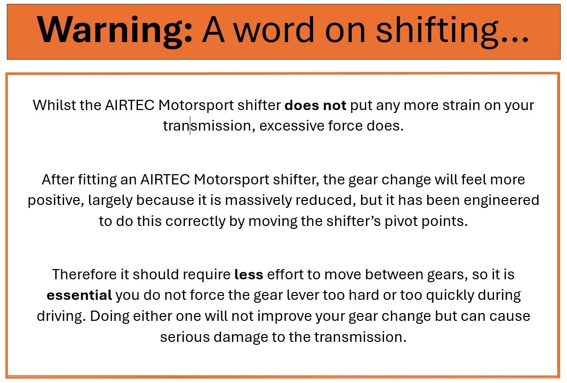 Where an OEM gear lever naturally centres but with little resistance, the AIRTEC Motorsport shifter features a heavy-duty, spring-loaded mechanism to self-centre it. Travel of the lever can also be finely adjusted to limit shift movements to a minimum, which all ensures there is no slack movement. Reverse gear can only be selected by lifting up the collar, ensuring it cannot be selected accidentally and there is also the option to lock out certain gears for competition use.