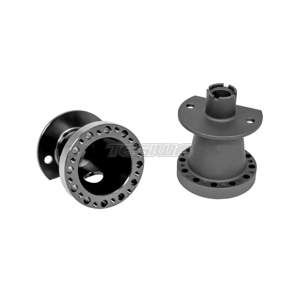 Ballade Sports aluminum steering wheel hub. Anodized in gloss or matt black. Made out of aluminum. Features a universal bolt pattern for Sparco/Momo/Nardi/Personal steering wheels. The height of the hub is specifically tailored to the Honda OEM steering wheel distance so it's not too far away from the wiper and turn signal switches. Works with SRS reel for easy horn button wiring. This design is inspired by the discontinued MUGEN DC5 steering wheel hub.