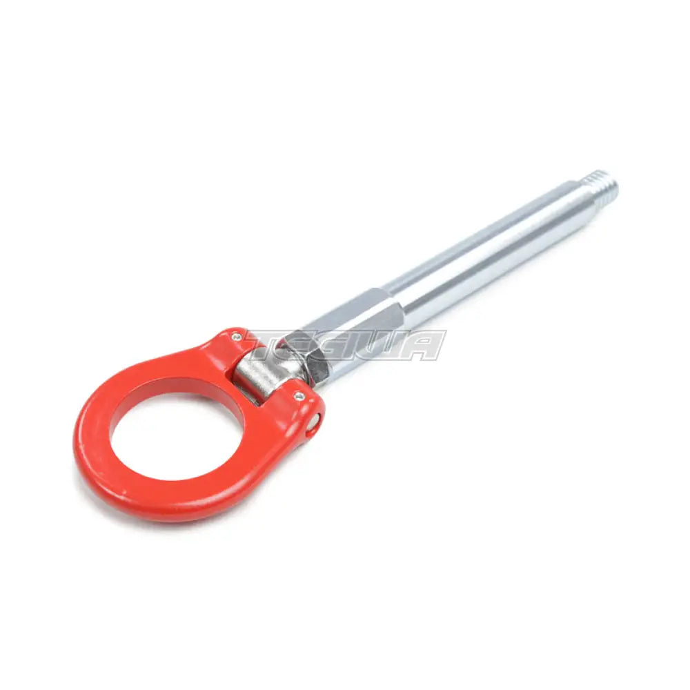 A tow hook with a check ball that can be folded and fixed at 0 and 90 degrees with a single touch. Made of durable, integrally molded steel without welding. High strength. Stylish red coloured hook. Bolt-on mounting onto genuine tow hook mount hole.