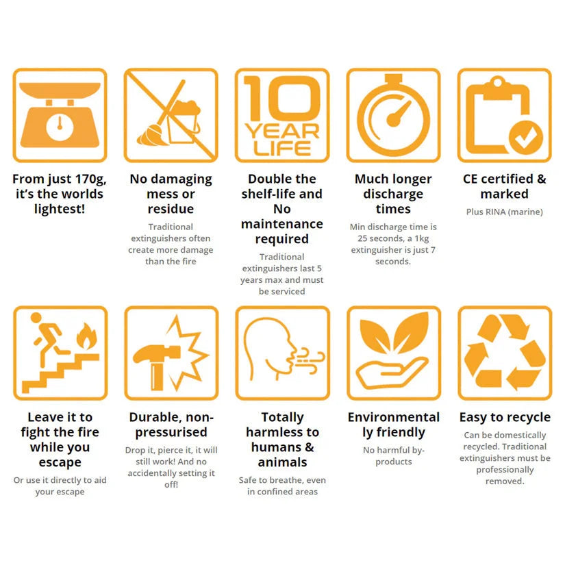 Fire Safety Stick is composed of stable, solid minerals; it does not contain gas and is not pressurised. The aerosol-like jet is only produced when the charger is struck with its base. The produced aerosol jet is free of thrust and is essentially an inert salt that emits gas already present in the atmosphere.