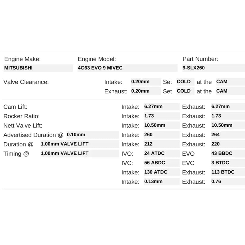 260° solid lifter cams to suit 32-40mm restrictor plate and GPA rally 4G63 engines. Good throttle response. 48-58mm turbo. Broader power band and improved throttle response when using MIVEC. Not for OEM hydraulic lifters, must convert to solid lifter. For up to 8000rpm and 35psi boost Kelford Cams recommend valve spring KVS63-BTK.