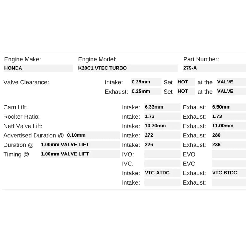 272°/280° cams for the K20C1 engine found in the Civic Type R Turbo. Cams suit street/track day cars. Suits 54-66mm turbo upgrade. For engines making 450hp+. Increase in mid-high rpm power. Valve spring upgrade required for high lift. For up to 9000rpm Kelford Cams recommend KVS279-BT. Valve to piston clearance needs checking.