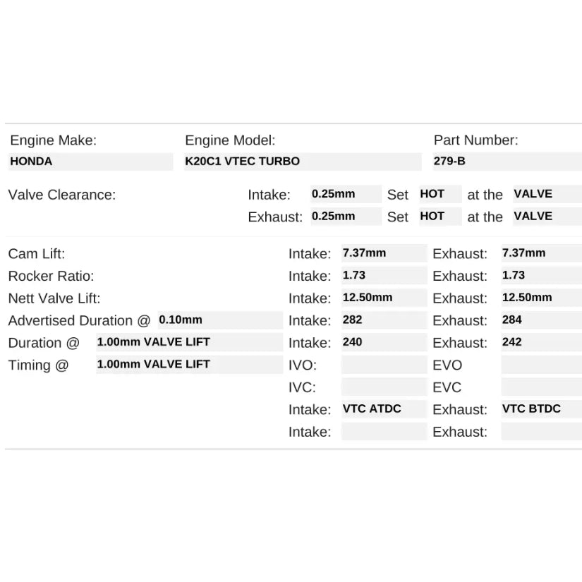 Racing cams for the K20C1 engine found in the Civic Type R Turbo. Cams suit motorsport applications such as circuit racing, roll racing and drag racing. Suits 64mm+ turbo. For professionally built engines making 700hp+. Valve spring upgrade required for high lift. For up to 9250rpm Kelford Cams recommend KVS279-BT. Valve to piston clearance needs checking. Primary exhaust lobe spec: 258° / 10.0mm