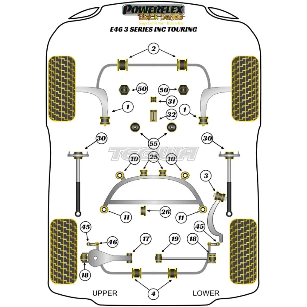 Powerflex Engine Mount BMW 3 Series E46 Sedan Touring Coupe Conv 99-06Tuneable engine mounts to suit your driving demands. This mount uses our Black 95A material and can be stiffened further using the Black 95A pins. It fits 6-cyl models only except the E46 Xi and Convertible models, and for the E9* it fits the M3 only. It will not fit any 4-cyl petrol models. An increase in NVH, usually at idle, should be expected when stiffening the connecting mount between the engine/transmission and chassis. The harder the material used, the greater the NVH transmitted. We do not recommend fitting these mounts to diesel-engined vehicles due to excessive NVH. The graph above shows Load vs Displacement, peaking at 5mm displacement. PFF5-4650BLK is nearly 700% stiffer than OE at 5mm compression.