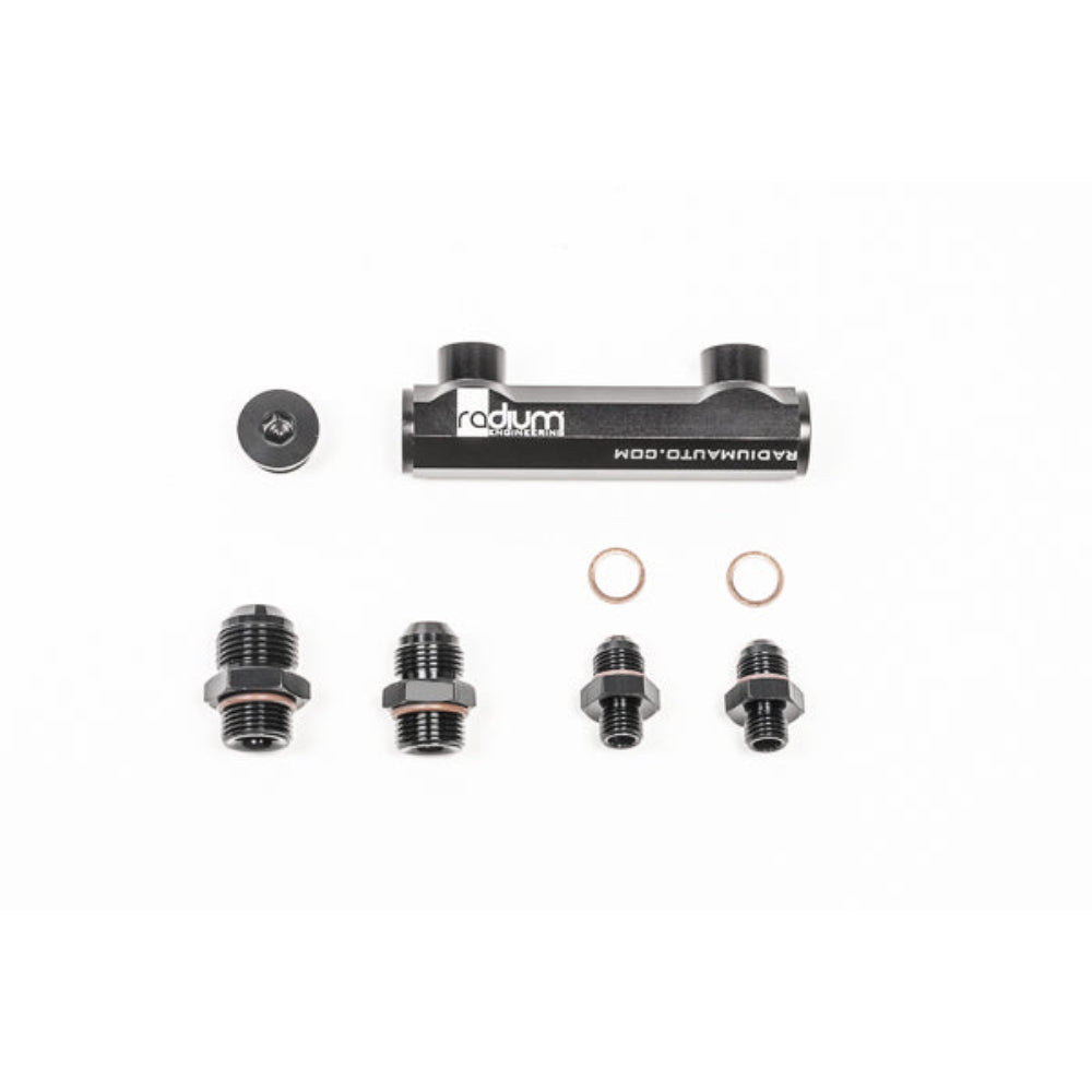 Radium Engineeing manifold compatible with 044 style bosch fuel pumps This aluminum CNC machined fitting allows flexibility when plumbing a coolant or fuel system using multiple pumps or fuel rails. It features two -6AN ORB (9/16-18 thread) ports and two -8AN ORB (3/4-16 thread) ports. Approximately 4.5" long. The 6AN ORB ports are 2.85" apart (center to center). Fully anodized and resistance to all fuel types. This allows flexibility when plumbing a fuel system using multiple Bosch pumps. NOTE: this kit eliminates the Bosch check valves. The pumps can NOT be staged. 4-Port Manifold8AN ORB Plug8AN ORB to 8AN Male8AN ORB to 10AN Male6AN ORB to M12x1.5 Male (x2)M12 Crush Washer (x2)