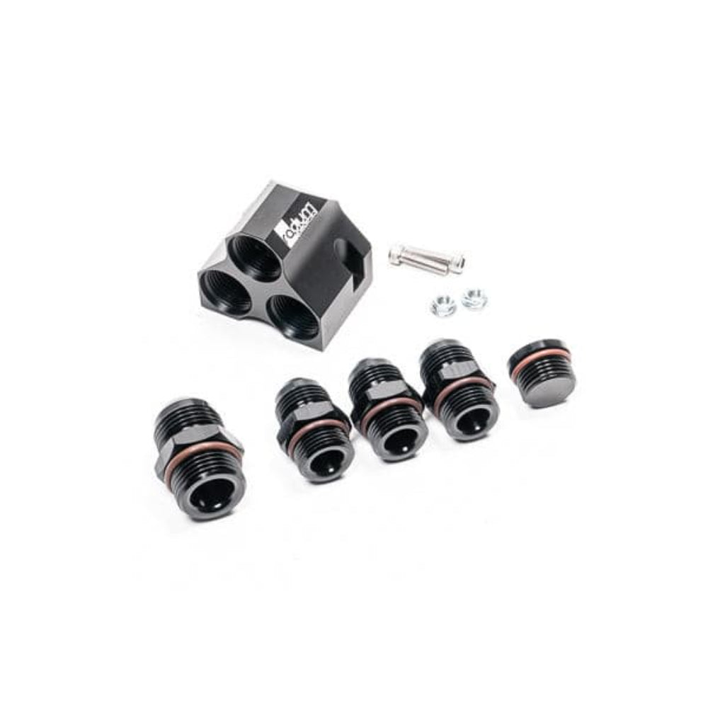 Includes: -Aluminum Threaded Block (x1) -12AN ORB to 12AN Male Fitting (x1) -10AN ORB to 10AN Male Fitting (x3) -10AN ORB Plug Fitting (x1) -Stainless M5x0.8mm Bolt (x2) -M5x0.8mm Flange Nut (x2)