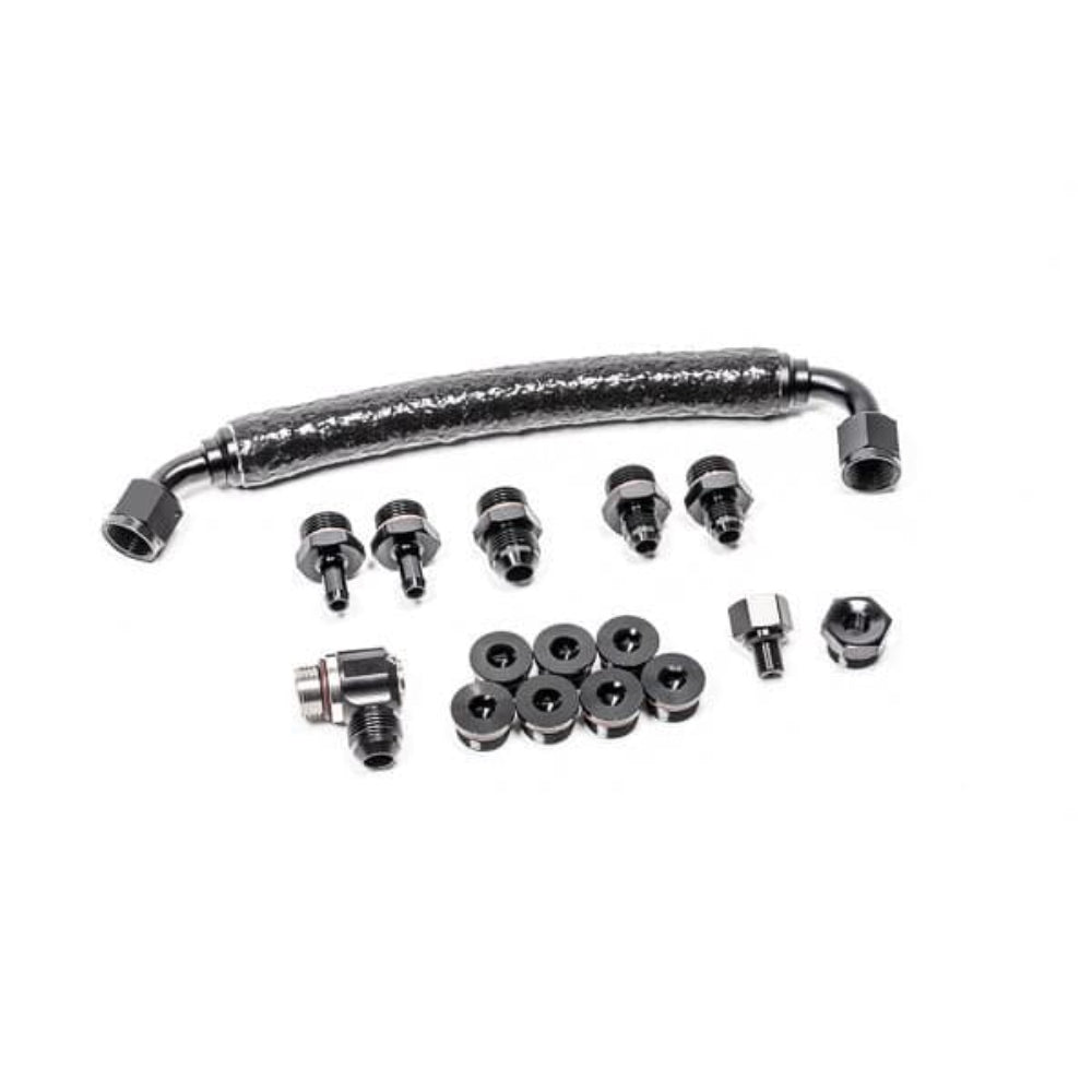 The plumbing kit allows a direct plug and play hookup to the OEM fuel system The barbed fittings shown in the picture above and below mimic the OEM fuel rails. With these installed, the OEM rubber hoses that come from the RH and LH high pressure fuel pumps can be reconnected. However, an extra set of 8AN ORB to 6AN male fittings are provided for connect aftermaket fuel lines, if necessary.