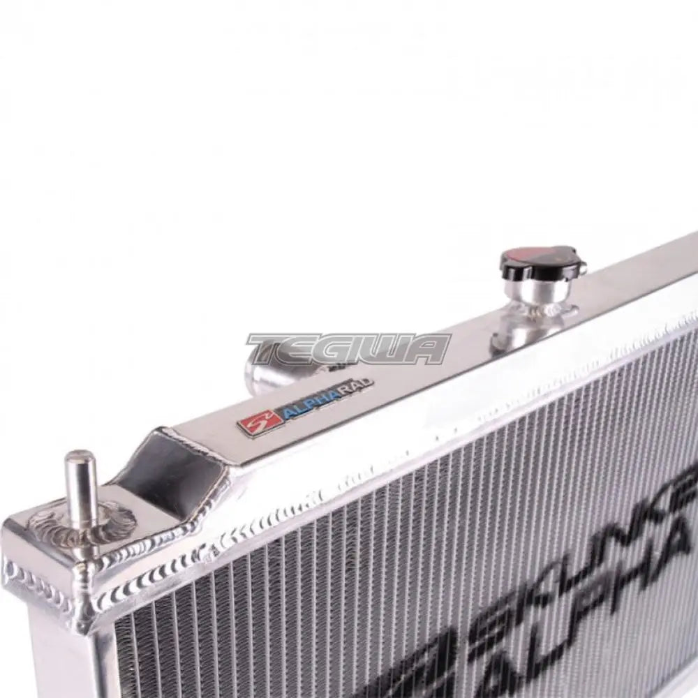 Alpha Series Radiators are manufactured from lightweight and durable aluminum, feature 100-percent brazed cores, and include polished end tanks with Skunk2’s signature Alpha logo embossed along each side. Each Alpha Series Radiator features a dual-core design, high-efficiency fins for maximum cooling capabilities, and includes a genuine Skunk2 Radiator Cap for maximum performance and a premium appearance. Each Alpha Series Radiator also includes provisions for the OEM cooling fan and larger 1.25 inch inlet and outlet, which makes it ideal for most engine swaps that utilize larger radiator hoses. See Notes.