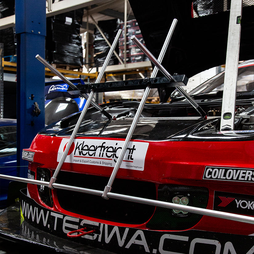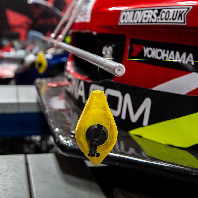 TI MOTORSPORT String Line Kit. This kit is the easiest and most accurate way to achieve four wheel alignment on almost any car. The main bar is fully adjustable to allow fitment to a wide range of cars and attaches to the vehicle using the rubber coated hooks on the arms. The string bars are split into 2 sections for ease of transportation. The string line bars also have a number of pre-machined grooves for the strings to locate in, making the kit suitable to cars of different widths.